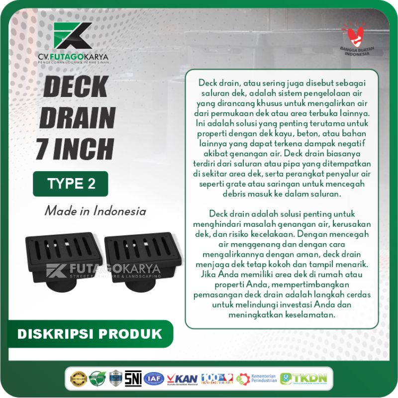 Siap meningkatkan kualitas drainase proyek Anda? Deck Drain 7 Inch Type 2 dari Futago Karya siap jadi solusi. Hubungi Futago Karya untuk konsultasi teknis dan pemesanan.