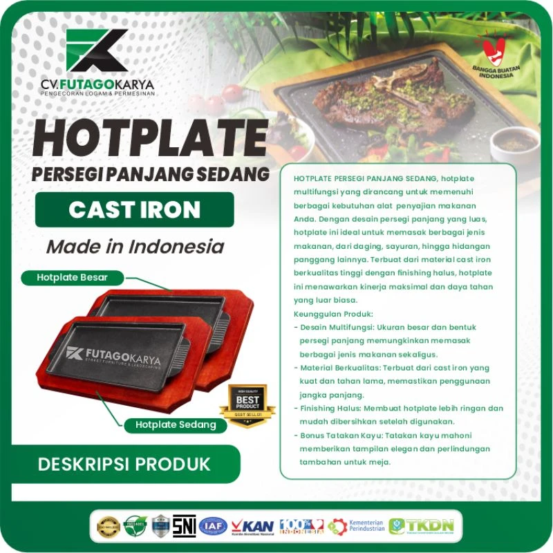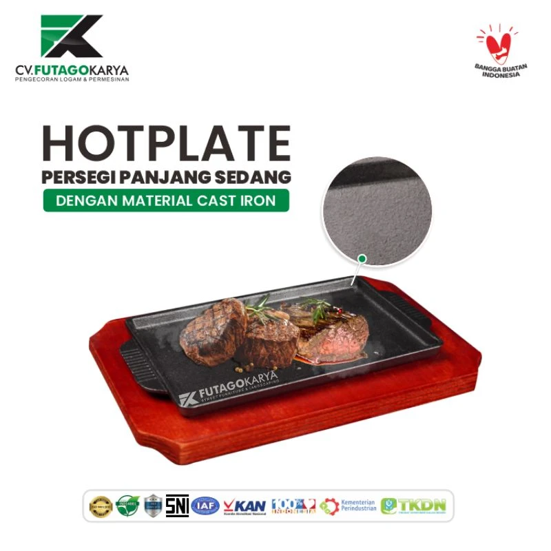 Semua proses produksi Hot Plate Persegi Panjang Ukuran Sedang dilakukan langsung oleh Futago Karya di fasilitas kami sendiri. Hal ini memberi kami kendali penuh terhadap kualitas material, proses pengecoran, finishing, hingga pengemasan akhir.
